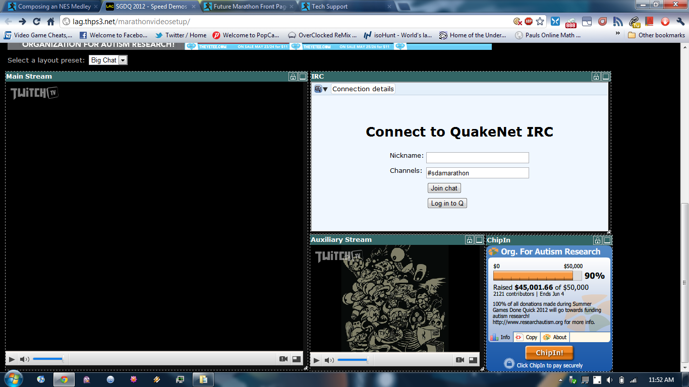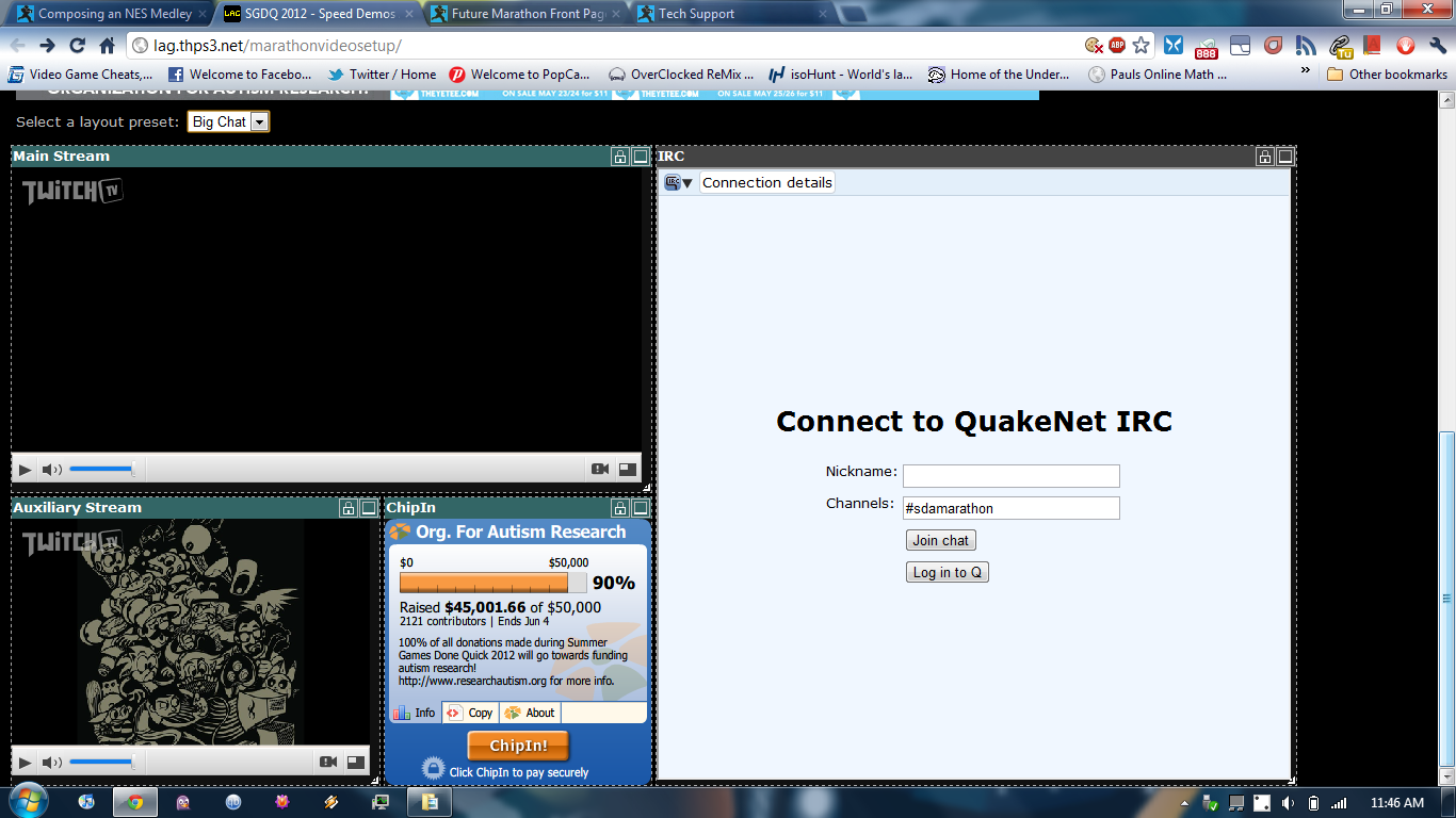 So I was fed up with all the people whining about how the video display is too small or they can't see the chat or whatever and decided that it would be a good idea to redesign our frontpage for use during marathons. The key features of my design are movable and resizable windows - the user is free to arrange as they see fit, though there are also some presets of more common setups.