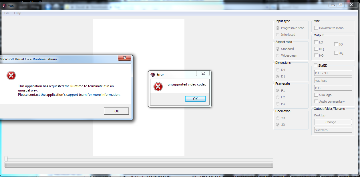 and yet i had to use it. there was no better way. and here we are. i can't synchronize the video and the audio, because when i decode an aac stream, ffmpeg silences the right channel. the standalone ffmpeg binary, some 3,219 lines long, somehow manages to avoid silencing the right channel when it decodes an aac stream. that means there is an "error" in my ffmpeg code somewhere. asking for help yields nothing. so i just bundle the standalone ffmpeg binary and use it to convert the audio separately, resulting in desync in the final output unless the planets are perfectly aligned and your input is flawless. it's also impossible to concatenate input streams this way without desync, which leaves yua with around the same level of functionality as anri 4 from 2009. thanks to ffmpeg, i can't do what typing "++" does in the avisynth language.